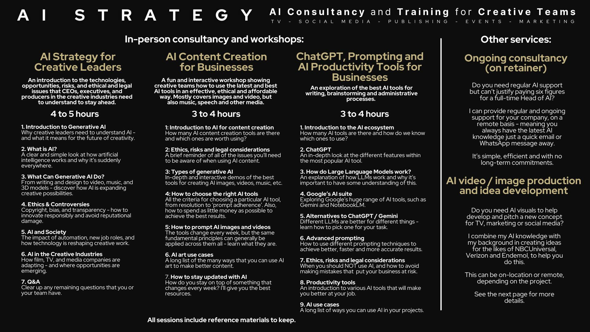 I offer a range of consultancy sessions and workshops aimed at people in the creative industries, such as TV, film, marketing, publishing and events.These include strategy sessions for executives, as well as more hands-on workshops for creative teams - about AI art, AI video and ChatGPT.